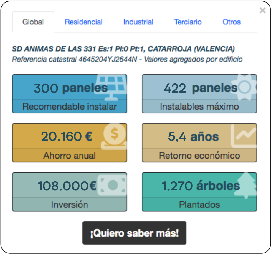 En global podemos ver los valores agregados para todo el edificio. Cuando hacemos click en Residencial, Industrial, Terciario u Otros, veremos los resultados medios para cada uno de esos usos. Es decir, si en un edificio hay 10 viviendas, en global veremos el potencial agregado de las 10 viviendas, pero en la pestaña residencial conoceremos el potencial medio por vivienda.